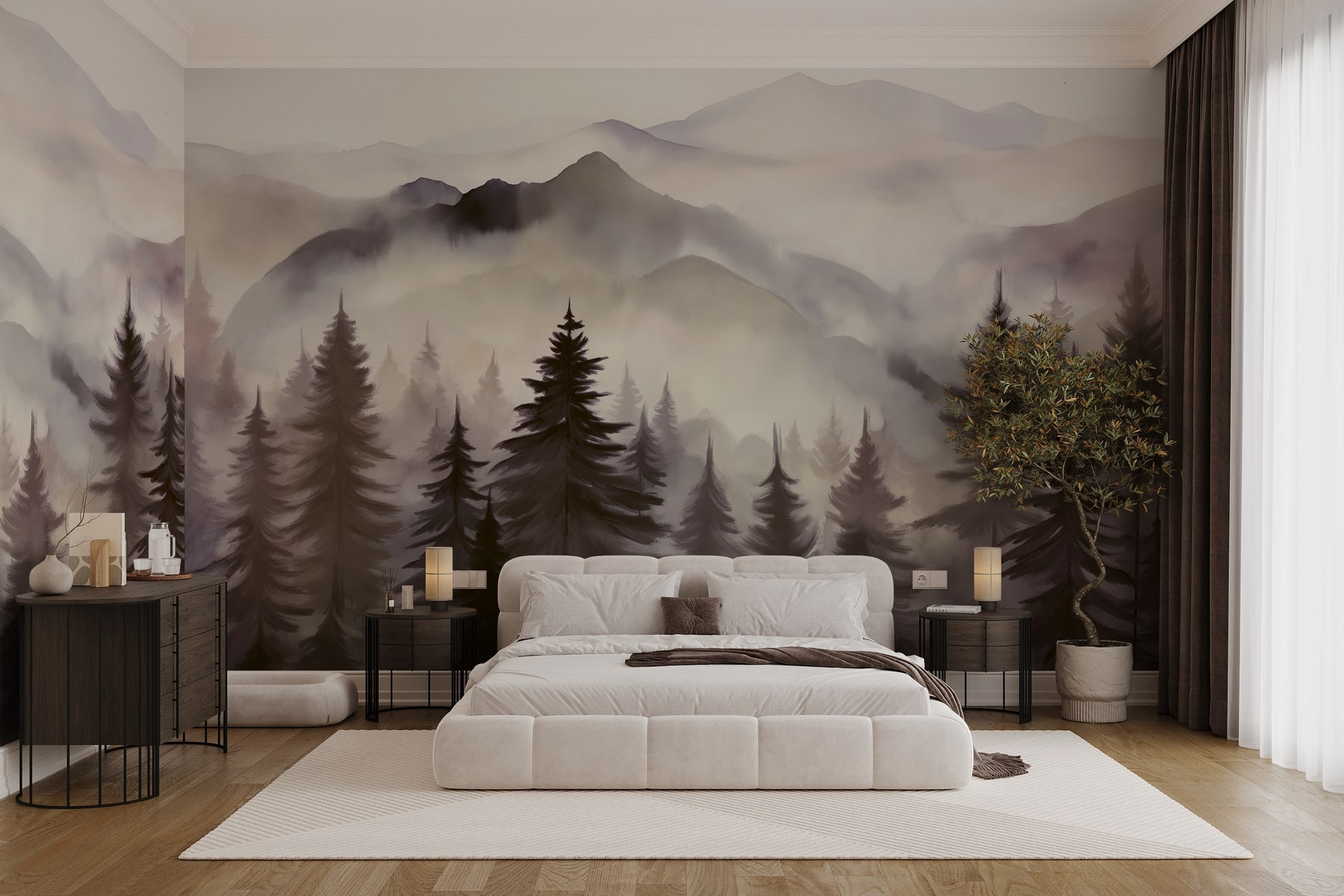 Proměňte každou místnost v klidné útočiště s touto úžasnou nástěnnou malbou se snovou krajinou hor a stromů. Představte si to: vejdete dovnitř a místo pohledu na hladké stěny vás přivítá mlhavá horská scéna, která našeptává dobrodružství. Ať už vás zaujme uklidňující zelená nebo jemná šedá, tato nástěnná malba vnese do interiéru klidnou, lesní atmosféru. Je to jako mít na zdi miniaturní dovolenou – ideální pro snění. Kdo by nechtěl být obklopen takovou krásou? Tak si vezměte šálek čaje, opřete se a nechte se unášet horami. Ideální pro milovníky přírody a všechny, kteří touží po doteku přírody přímo u sebe doma!