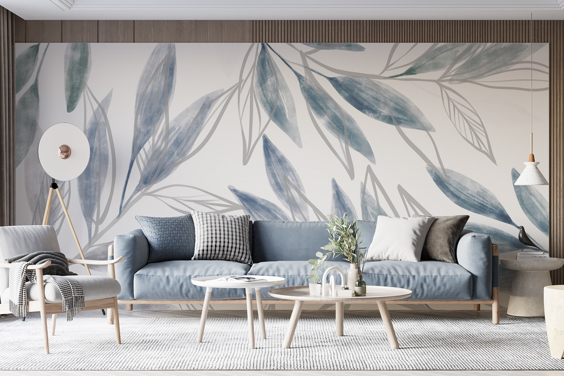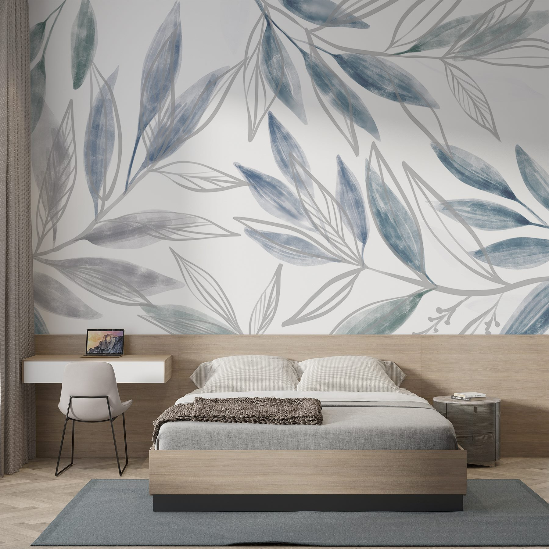 Proměňte svůj prostor v klidné útočiště s nástěnnou malbou “Přírodní elegance v jemných odstínech”. Představte si, že se probouzíte do něžného objetí listové zeleně a jemné modři, jako by příroda vstoupila přímo dovnitř. Tato fototapeta není jen ozdobou stěny – pozve do vašeho domova závan čerstvého vzduchu a vytvoří klidnou atmosféru, která vám pošeptá: “Hej, udělejte si chvilku na odpočinek.”