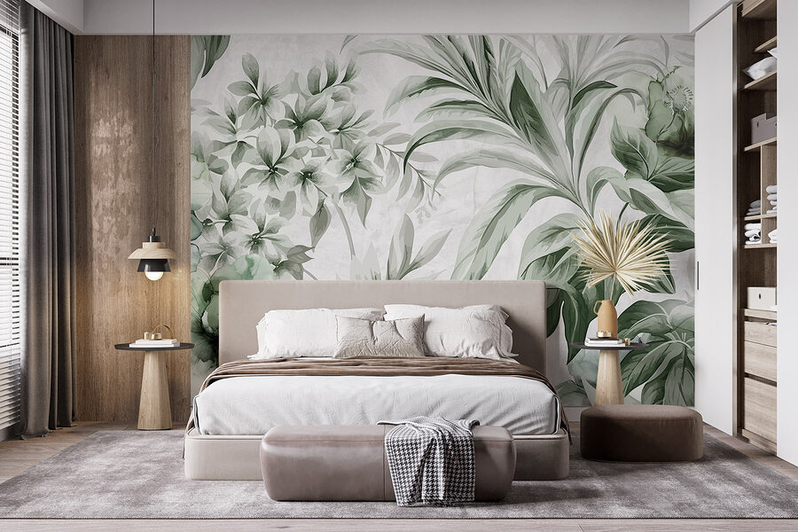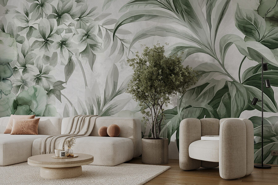 Proměňte jakýkoli prostor pomocí nástěnné malby “Jemné odstíny botanické elegance”. Představte si to: ležíte v obývacím pokoji obklopeni jemnou zelení a měkkými květinovými potisky, které našeptávají klid. Je to jako přenést si do interiéru klidnou zahradu – bez problémů s alergiemi. Jemná paleta zeleně a decentních květů vytváří klidnou atmosféru, která je ideální pro odpočinek po hektickém dni nebo pro sdílení milých chvil s přáteli. Možná se dokonce přistihnete, jak sníte o líných odpoledních na sluncem zalitém poli. Je to víc než stěna, je to atmosféra – útulná pozvánka k odpočinku a nasávání krásy přírody přímo u vás doma. Jen si představte ty komplimenty od hostů, až vejdou dovnitř!