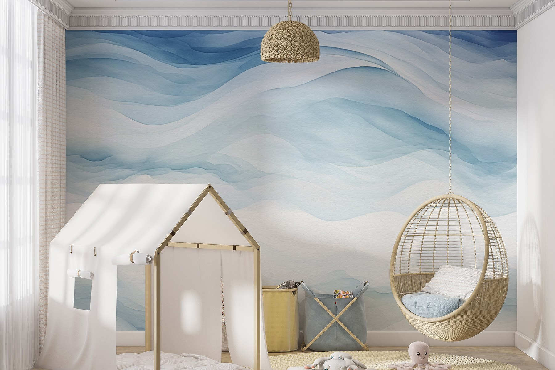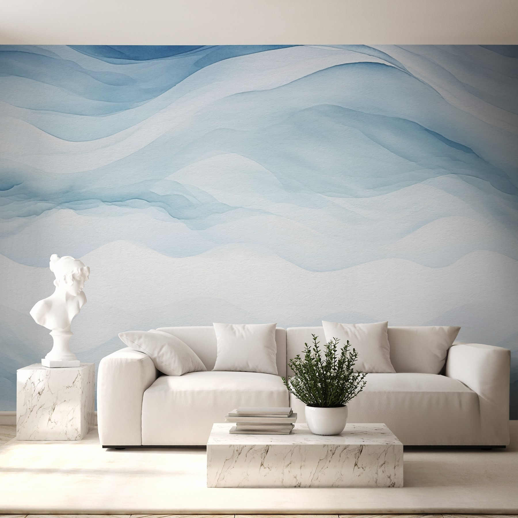 Proměňte jakoukoli stěnu ve snový únik s touto okouzlující akvarelovou fototapetou. Díky jemným bílým a modrým odstínům působí jako pohled na jemné vlny šplouchající na břehu – klidný a uklidňující. Představte si, že se schoulíte do klubíčka s dobrou knihou a uklidňující obrazy vás obklopí jako příjemná deka. Je ideální do zákoutí, kde popíjíte ranní kávu nebo se věnujete svému oblíbenému seriálu. Navíc se o něm vaši přátelé budou ptát: “Páni, kde jsi to vzal?”. Trocha kreativity dokáže udělat hodně a jemná elegance této nástěnné malby z ní dělá vynikající volbu pro jakýkoli prostor.
