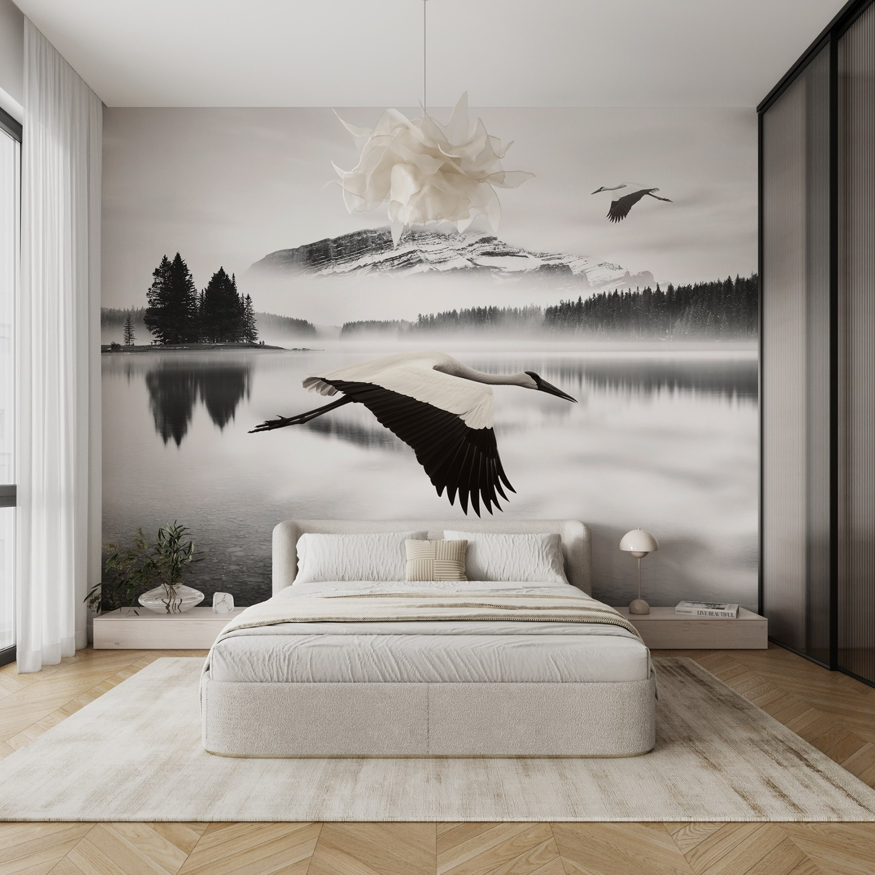 Proměňte svůj prostor pomocí této úchvatné nástěnné malby “Pták letící nad vodou”. Představte si klidnou krajinu, kde ladný jeřáb plachtí po mlžném jezeře a vyzařuje klid. Je to jako přenést si kus přírody do interiéru – není třeba mít zablácené boty ani sprej proti hmyzu! Tato nástěnná malba je ideální na prázdnou stěnu, která si říká o osobitý vzhled, a vnese do vašeho hektického dne klid.
