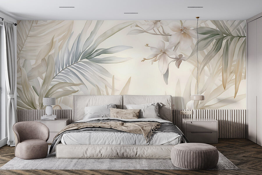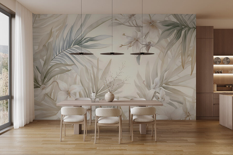 Proměňte každou místnost v uklidňující oázu s nástěnnou malbou “Křehké květy a jemné listí”. Představte si, jak za líného odpoledne popíjíte čaj, jemné sluneční světlo proniká skrze tyto krásné listy a celý prostor působí lehce a vzdušně. Jemné barvy a lákavé květinové vzory této nástěnné malby vás mohou přenést do klidné zahrady, bez otravného hmyzu! Je ideální pro každého, kdo touží přidat do interiéru dotek přírody, něco jako přenést kousek venkovního světa dovnitř – aniž by potřeboval zelený palec. Ať už se jedná o útulný koutek nebo hlavní stěnu, prostě zahalí místnost do tepla a šarmu. Kdo by nechtěl trávit líné dny obklopen takovou krásou?