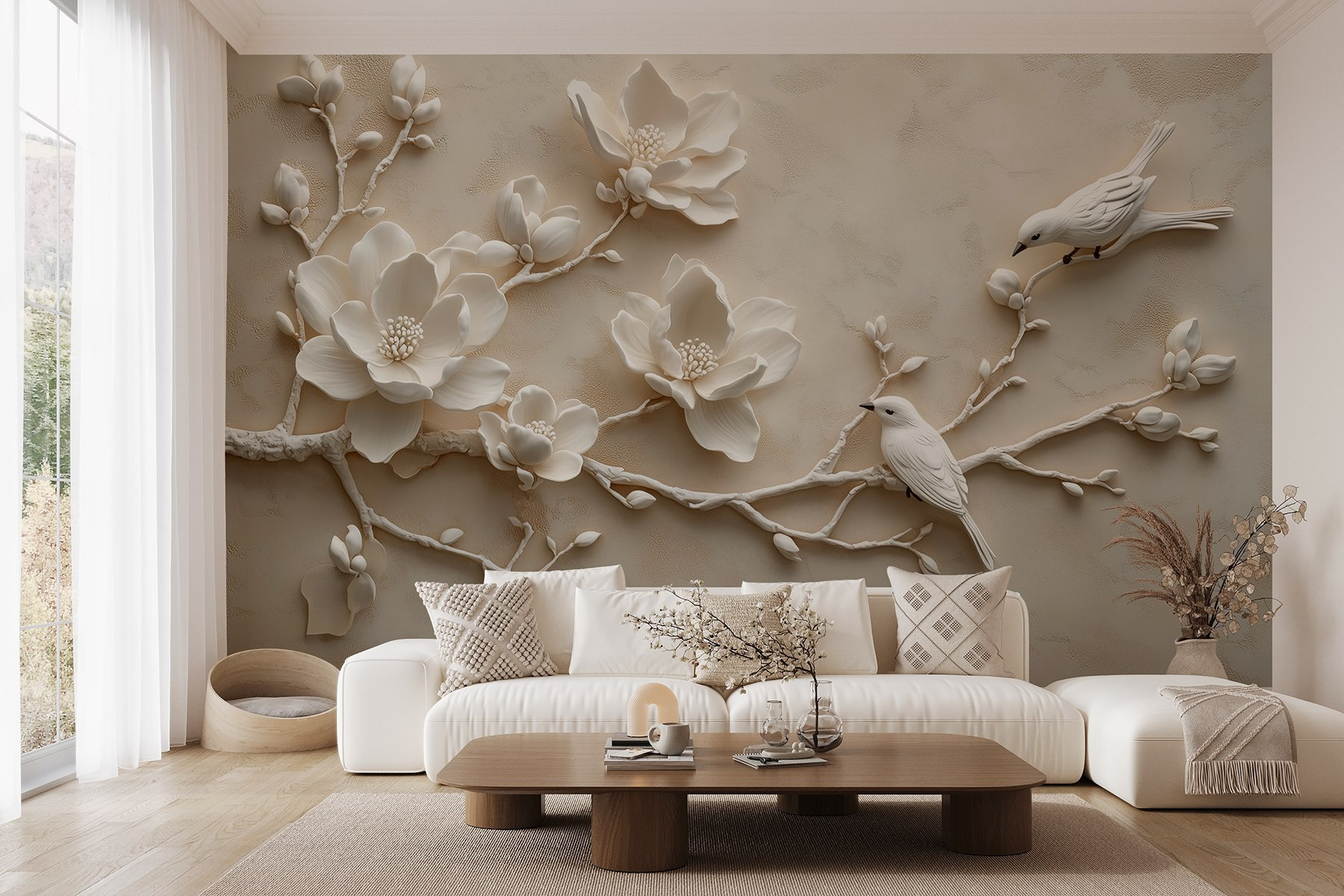 Představte si, že vstoupíte do místnosti, kde příroda tiše šeptá skrze stěny. Tato nástěnná malba s jemnými bílými ptáky sedícími na vlající větvi zdobené květy přesně tohle splňuje. Jemná elegance květin navozuje pocit klidu – ideální pro útulný čtecí koutek nebo klidnou ložnici. Je to jako vnést do interiéru dotek jara, a to bez alergií! Je něco rozmarného na tom, jak si ti malí ptáčci jakoby cvrlikají tajemství. Pociťte klid, který se ve vás rozlije, když tato nástěnná malba promění váš prostor ve snový únik. Ideální pro ty, kteří ocení krásu přírody bez nepořádné údržby. Mluvte o výhře pro všechny!