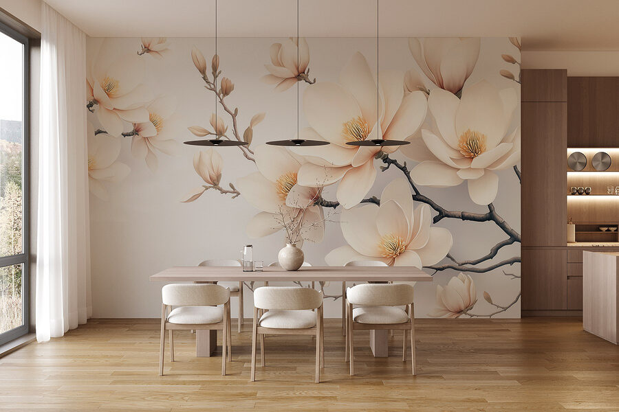 Proměňte svůj prostor pomocí tapety „Jemné květy v jemných odstínech“, kde se snoubí sofistikovanost s klidem. Představte si, že každý den vstupujete do klidné zahrady – ty snové bílé květy se elegantně rozvíjejí na jemném pozadí a vyzařují klidnou atmosféru. Představte si, jak se zachumláte s dobrou knížkou nebo popíjíte kávu, obklopeni krásou přírody, ale bez pylu! Není to jen dekorace, je to jako pozvat jaro přímo do vašeho obývacího pokoje. Ať už se jedná o útulný koutek nebo živou jídelnu, tyto květy jsou tu, aby je zkrášlily. Stačí jen nádech elegance a voilà! Vaše stěny okamžitě působí jako závan čerstvého vzduchu. Kdo by řekl, že nástěnná malba může rozkvétat s takovým šarmem?