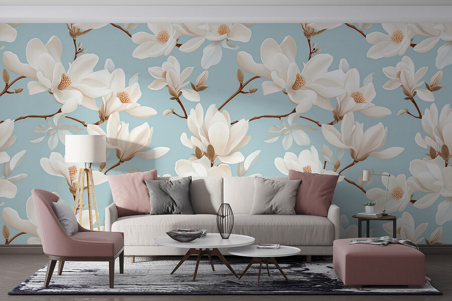 Proměňte svůj prostor pomocí úchvatné „nástěnné malby s motivem bílých květů“. Představte si, že vstupujete do místnosti, kde na pozadí uklidňující modré oblohy kvetou půvabné magnólie. Je to jako mít jaro ve svém domě po celý rok! Jemné okvětní lístky a měkké barvy vytvářejí uklidňující atmosféru – ideální pro odpočinek po dlouhém dni nebo pro čtení dobré knihy. Přátelé vejdou dovnitř a budou si myslet, že jste se schovali do bujné zahrady! Navíc vám to připomene, že krása může být jen o jednu zeď dál. Kdo by řekl, že domácí dekorace může být tak osvěžující a veselá?