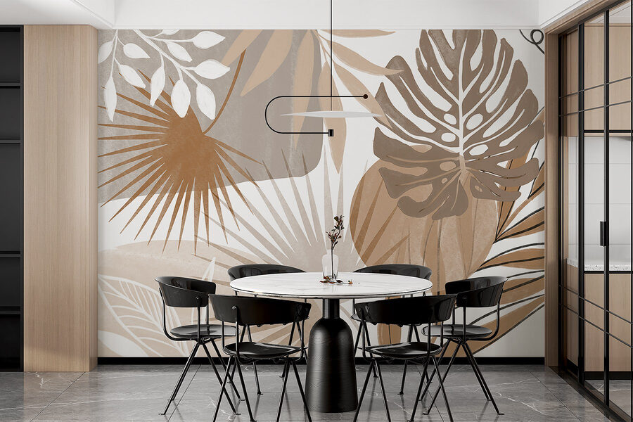 Proměňte svůj prostor pomocí této úchvatné nástěnné malby s abstraktním vzorem inspirovaným přírodou. Představte si, že vstoupíte do svého pokoje a přivítá vás ohromující příval zemitých tónů a půvabných listů. Je to jako přenést si kousek tropické oázy přímo do svého domova.