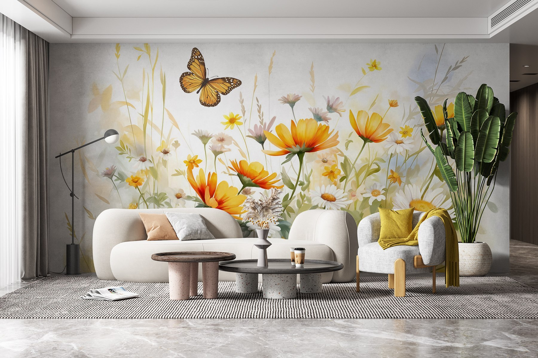 Proměňte svůj prostor v živou zahradu s touto úžasnou nástěnnou malbou motýla poletujícího nad polem květin. Přináší hravý dotek přírody, díky němuž bude každá místnost působit svěže a příjemně. Představte si, jak popíjíte kávu a kocháte se tímto veselým výjevem – je to jako mít kousek jara přímo na zdi, bez bolesti hlavy z pylu. Výbuchy barev vám mohou zvednout náladu a inspirovat vaše okolí. Je to dokonalé pozadí pro útulný čtecí koutek nebo živou hernu. Kdo by se nechtěl ponořit do této květinové fantazie?