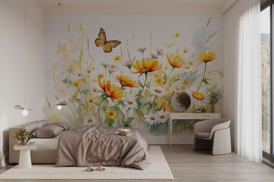 Proměňte svůj prostor v živou zahradu s touto úžasnou nástěnnou malbou motýla poletujícího nad polem květin. Přináší hravý dotek přírody, díky němuž bude každá místnost působit svěže a příjemně. Představte si, jak popíjíte kávu a kocháte se tímto veselým výjevem – je to jako mít kousek jara přímo na zdi, bez bolesti hlavy z pylu. Výbuchy barev vám mohou zvednout náladu a inspirovat vaše okolí. Je to dokonalé pozadí pro útulný čtecí koutek nebo živou hernu. Kdo by se nechtěl ponořit do této květinové fantazie?