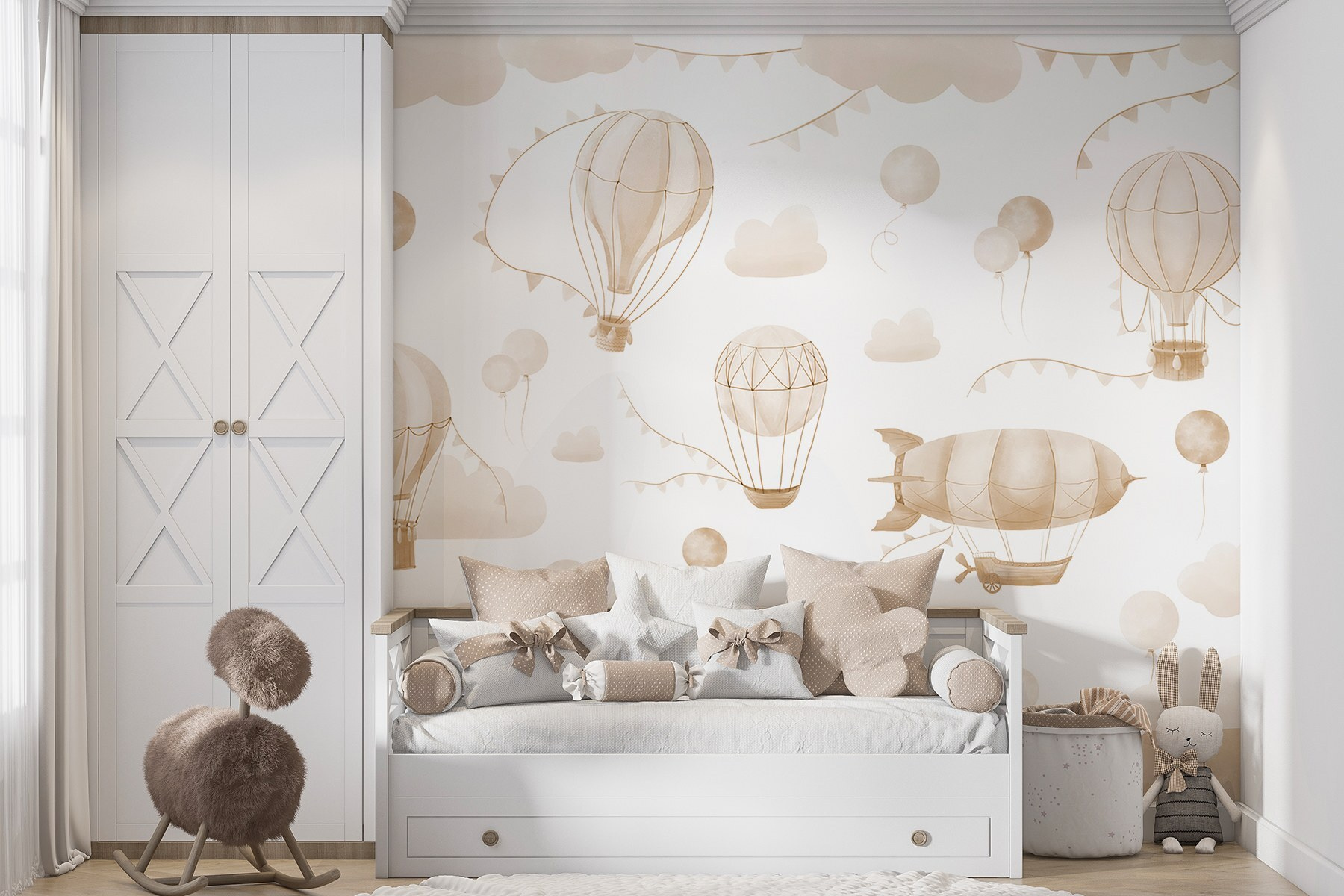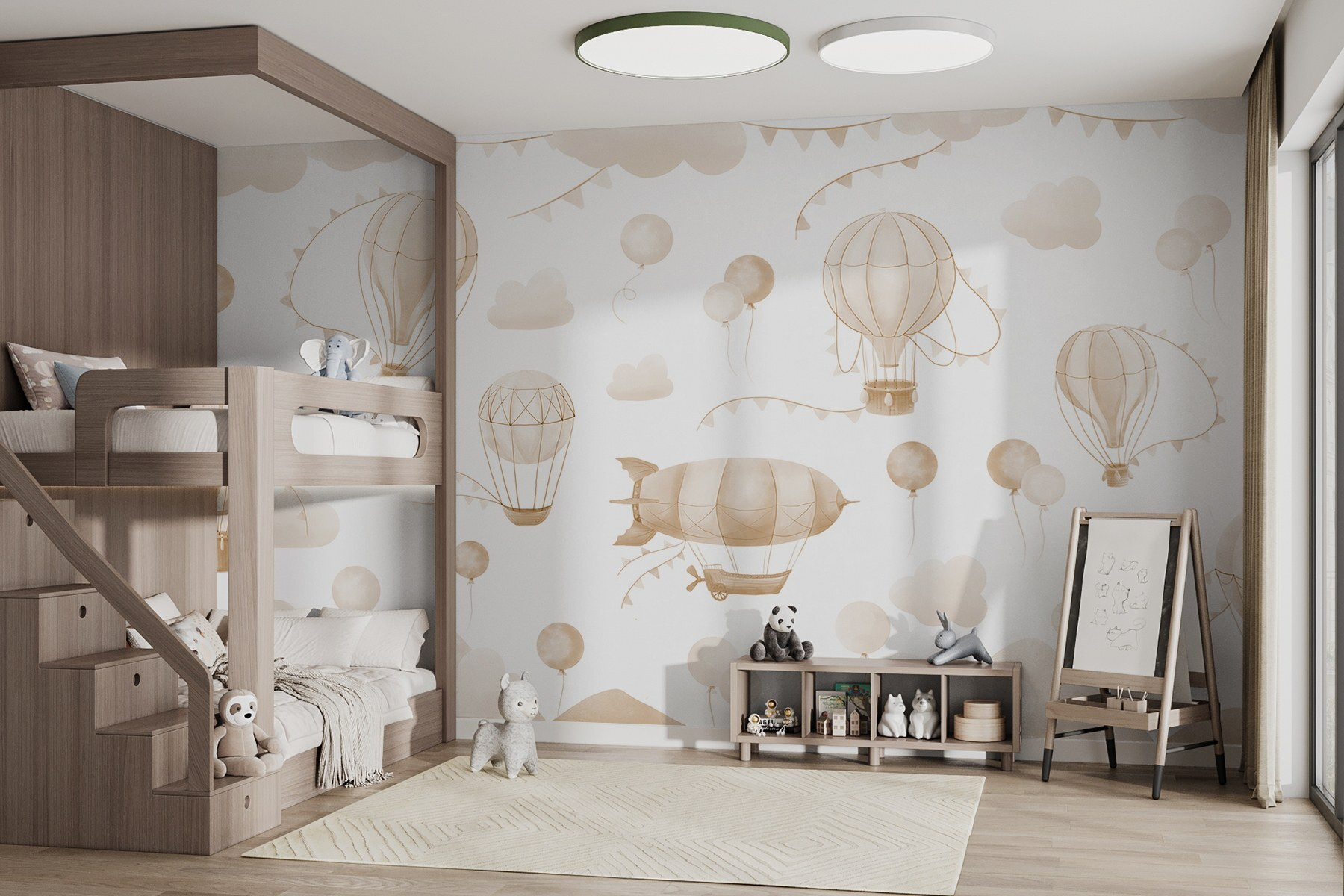 Proměňte jakoukoli místnost pomocí této rozmarné nástěnné malby s živou skupinou horkovzdušných balónů plujících nad mírnými horami. Je to jako přenést kousek dobrodružství do interiéru, kde každý pohled působí jako pohled do nekonečné oblohy. Jemné odstíny vybízejí k uvolněné atmosféře, která je ideální pro útulné prostory, kde ožívá snění. Představte si, že popíjíte čaj a sledujete, jak se kolem vás vznášejí tyto okouzlující balónky, z nichž každý podněcuje malou představivost. Ať už v dětském pokoji nebo v kreativním koutku, tato nástěnná malba dodá rozkošný nádech radosti a připomene každému, aby vždy mířil vysoko a snil ve velkém.