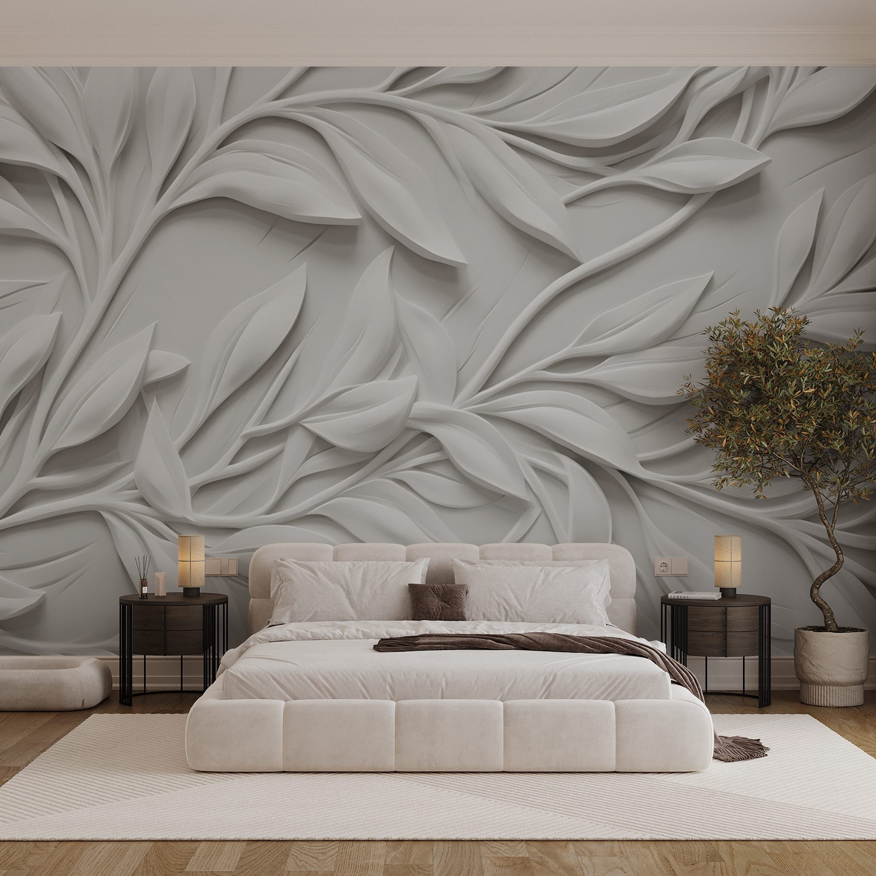 Proměňte svůj prostor pomocí této úchvatné tapety „Bílá zeď s listy“. Představte si, že vstupujete do místnosti, kde se po stěnách zdánlivě vznáší jemné, plastické listy. Je to, jako by si příroda udělala malou dovolenou uvnitř! Čistě bílé pozadí nechává vyniknout složité vzory listů a vytváří svěží atmosféru, která je uklidňující a zároveň elegantní. Přátelé si možná budou myslet, že jste si domů přinesli kousek krásné zahrady. Tato tapeta je ideální pro útulný čtecí koutek nebo sofistikovanou jídelnu a dodává každé místnosti nádech elegance, díky kterému působí o něco luxusněji. Umíte si představit, jak popíjíte čaj a kocháte se klidnou krásou?