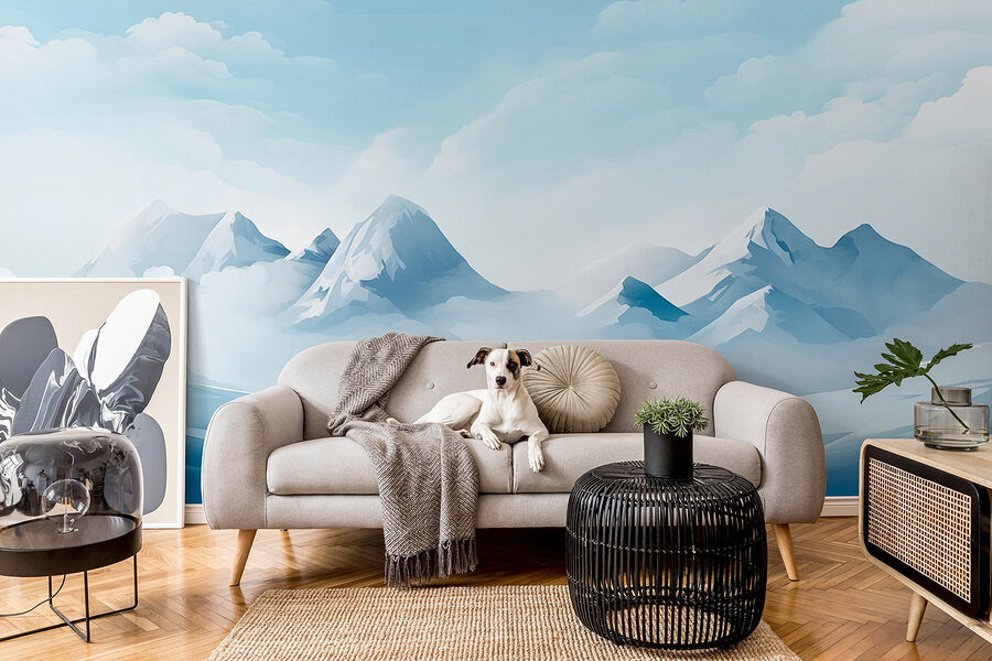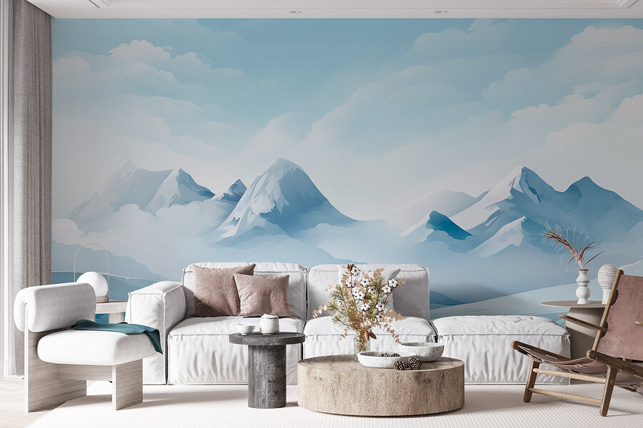 Jemné modré a bílé odstíny vytvářejí uklidňující atmosféru, ideální pro odpočinek po náročném dni. Vaši přátelé se možná budou divit, zda jste si pořídili okno do zimní říše divů. Kdokoli řekl, že si nemůžete přinést hory domů, zjevně neměl na mysli tuto tapetu. Ponořte se do klidu s tímto dílem, které zachycuje klid přírody na první pohled.