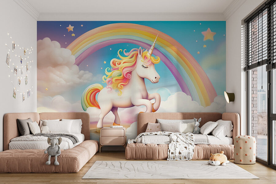 Proměňte jakoukoli místnost v pohádkovou říši divů s touto okouzlující nástěnnou malbou, na které se vesele skotačí jednorožec v oblacích pod zářivou duhou! Je to jako hravý sen, který nikdy nekončí, ideální pro rozvíjení fantazie. Děti (a upřímně řečeno i dospělí) budou milovat tuto magickou atmosféru. Představte si čtení pohádek plné smíchu nebo útulný prostor, kde kreativita volně proudí. Jemné barvy této tapety tvoří krásné pozadí – uklidňující, ale zároveň vzrušující, což z ní dělá ideální doplněk do herny nebo dětského pokoje. Kdo by nechtěl každé ráno vstávat s trochou magie?