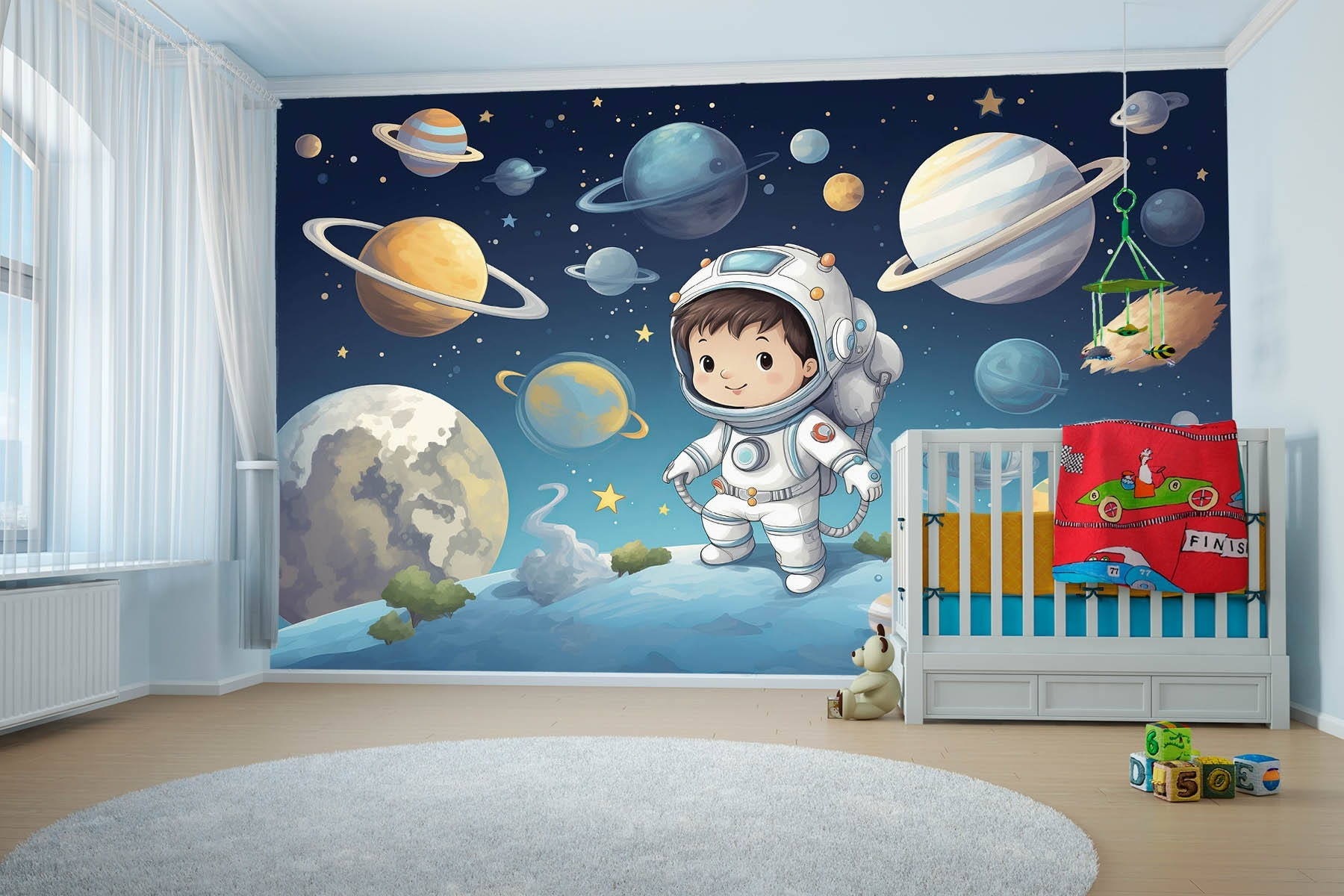 Blast off to adventure with this delightful wall mural featuring an adorable boy in a space suit! Picture this: a room transformed into a cosmic playground where imaginations can soar higher than Saturn’s rings. The vibrant colors capture the enchanting beauty of the galaxy. Little ones can dream big, floating among planets and stars that spark curiosity and joy! Whether it’s for a nursery or a playroom, this mural adds whimsy and a splash of cosmic magic. Who wouldn’t want to chase meteors while munching on snacks? It’s like having a mini astronaut ready for interstellar fun right on the wall!