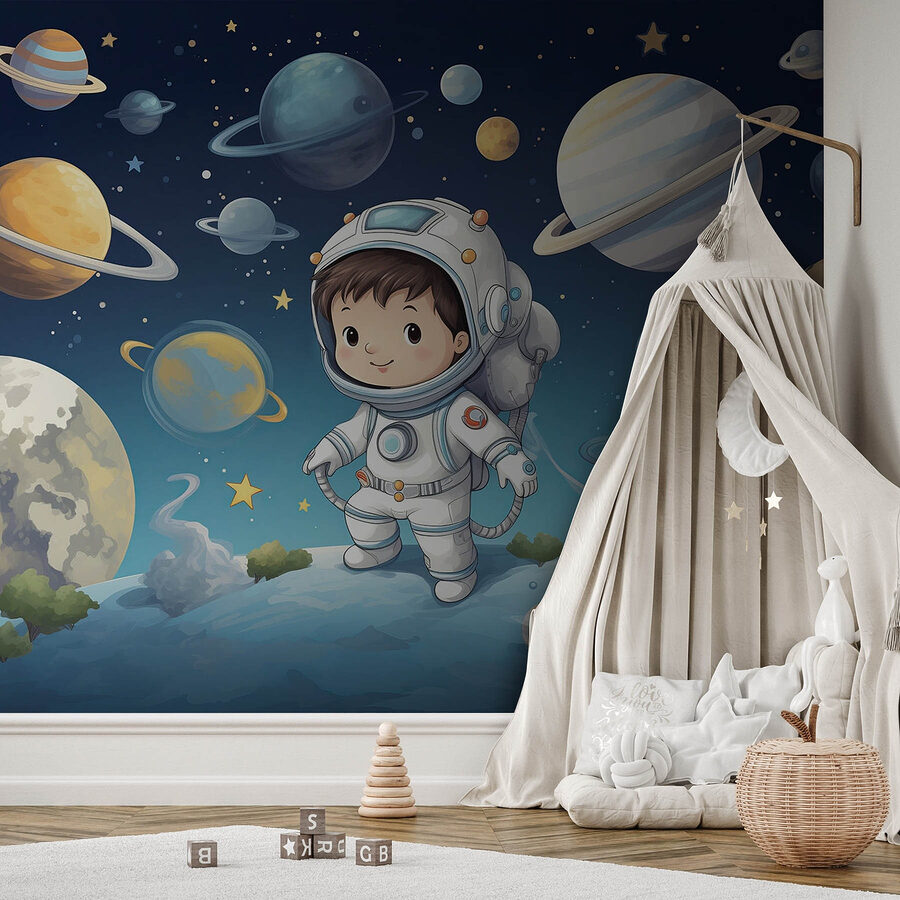 Vydejte se na dobrodružství s touto nádhernou tapetou, na které je vyobrazen roztomilý chlapec v kosmickém skafandru! Představte si to: pokoj proměněný v kosmické hřiště, kde fantazie může létat výš než Saturnovy prstence. Živé barvy zachycují okouzlující krásu galaxie. Malí mohou snít ve velkém, vznášet se mezi planetami a hvězdami, které vzbuzují zvědavost a radost! Ať už je to do dětského pokoje nebo herny, tato tapeta dodá místnosti fantazii a kosmickou magii. Kdo by nechtěl honit meteory a přitom mlsat svačinky? Je to jako mít na zdi malého astronauta připraveného na mezihvězdnou zábavu!