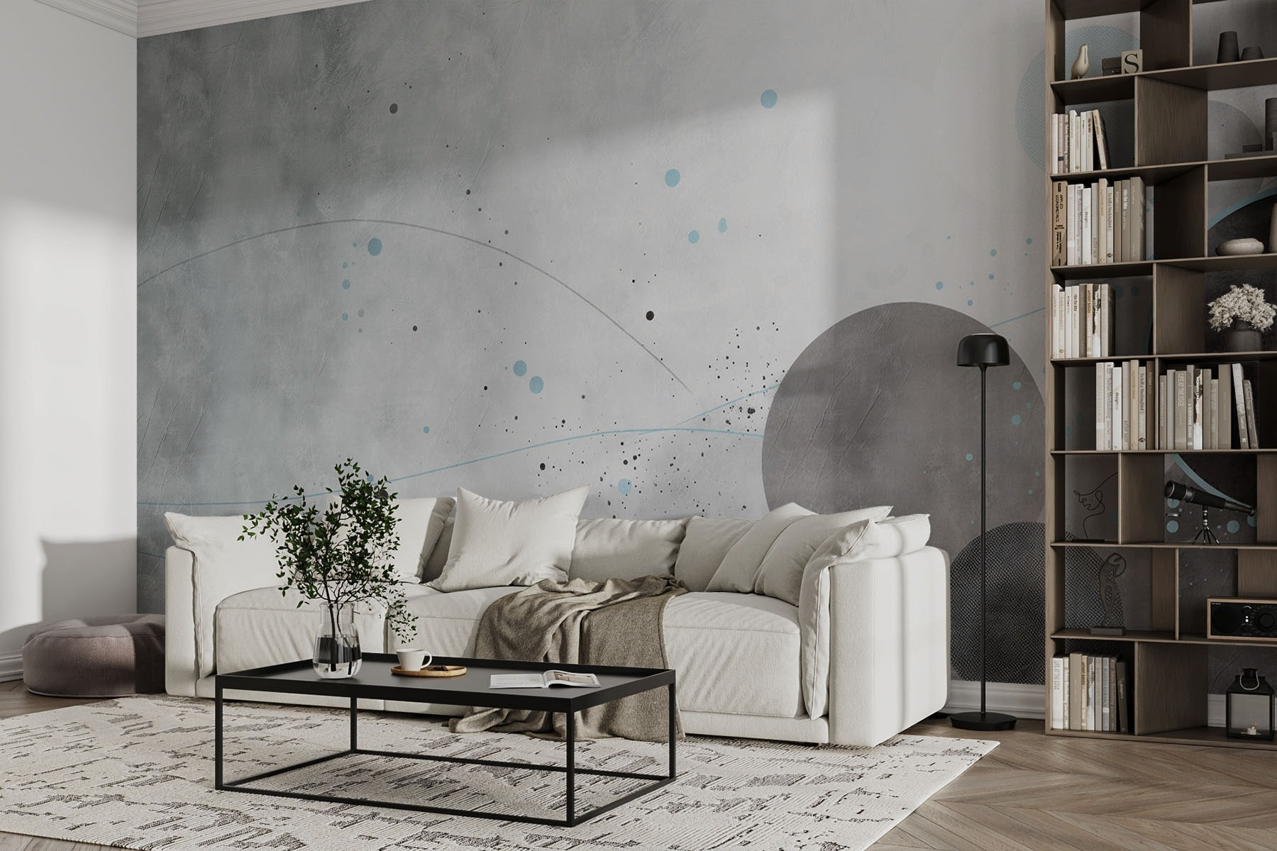Vstupte do světa uklidňujících vibrací s touto nástěnnou malbou s odstíny šedých a modrých kruhů doprovázených jemnými liniemi, které jako by tančily po povrchu. Je to jako rozhovor mezi barvami, který šeptá tajemství klidu a tvořivosti. Představte si, že popíjíte ranní kávu v útulném zákoutí a jemné odstíny vás obklopují jako hřejivé objetí. Tato nástěnná malba, ideální pro moderní estetiku, vybízí ke snění a hlubokým myšlenkám. Ať už se jedná o obývací pokoj, nebo kreativní prostor, nastaví ten správný tón – povzbudivý a zároveň osvěžující. Dejte sbohem nudným stěnám a přivítejte stříkající inspiraci!