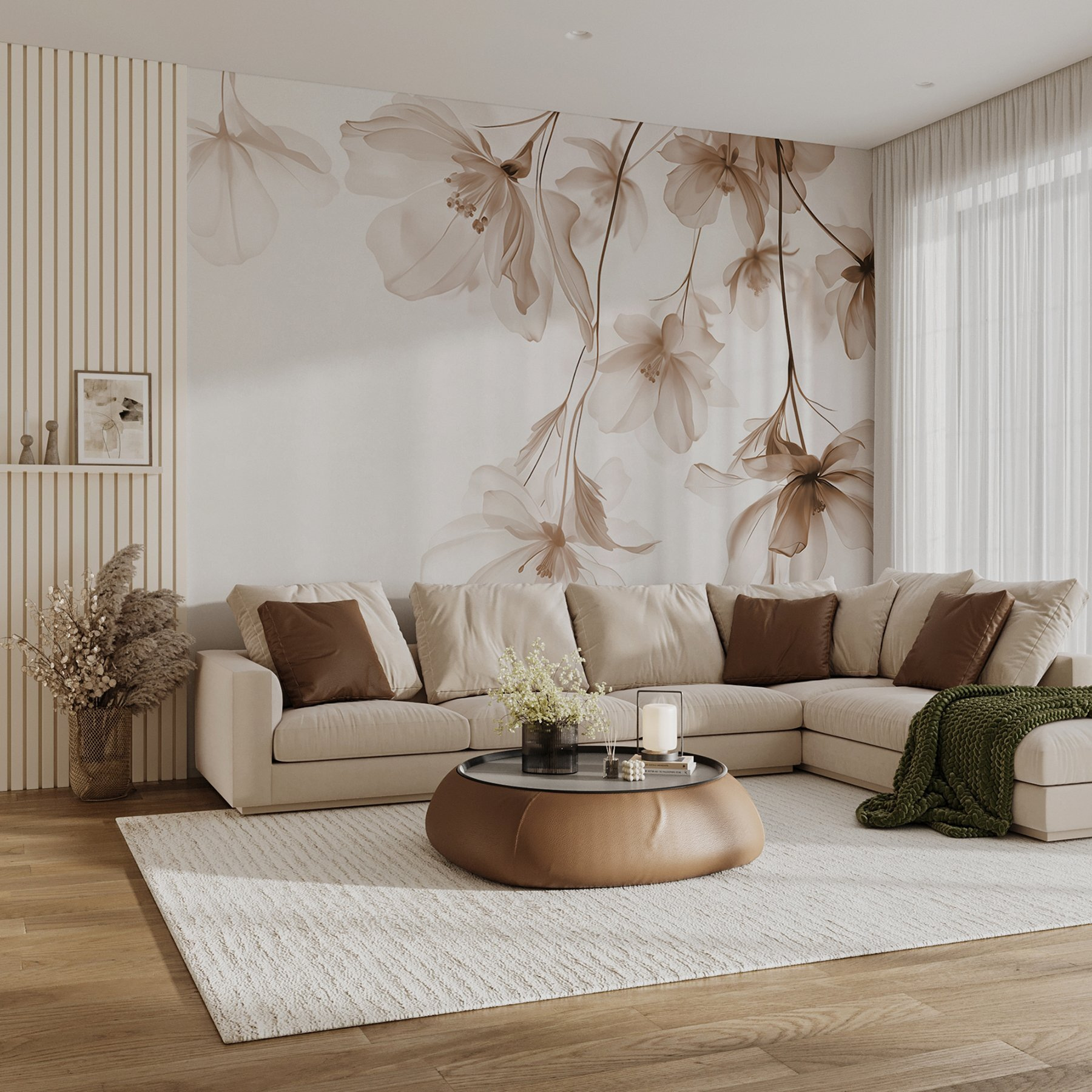 Proměňte jakýkoli prostor pomocí této úžasné nástěnné malby s jemnými květy v jemných odstínech. Představte si, že přímo z obývacího pokoje vstoupíte do klidné zahrady – každá květina šeptá klid, jako by ožila přírodní malba. Není to jen dekorace, je to zážitek. Představte si, že hostíte přátele a jejich rozhovory ustupují do pozadí, zatímco obdivují tuto nádhernou podívanou. Jemné barvy vdechují místnosti teplo, díky čemuž působí otevřeně a přívětivě. Ideální pro vytvoření atmosféry klidného útočiště. Kousek ráje přímo na vaší zdi.