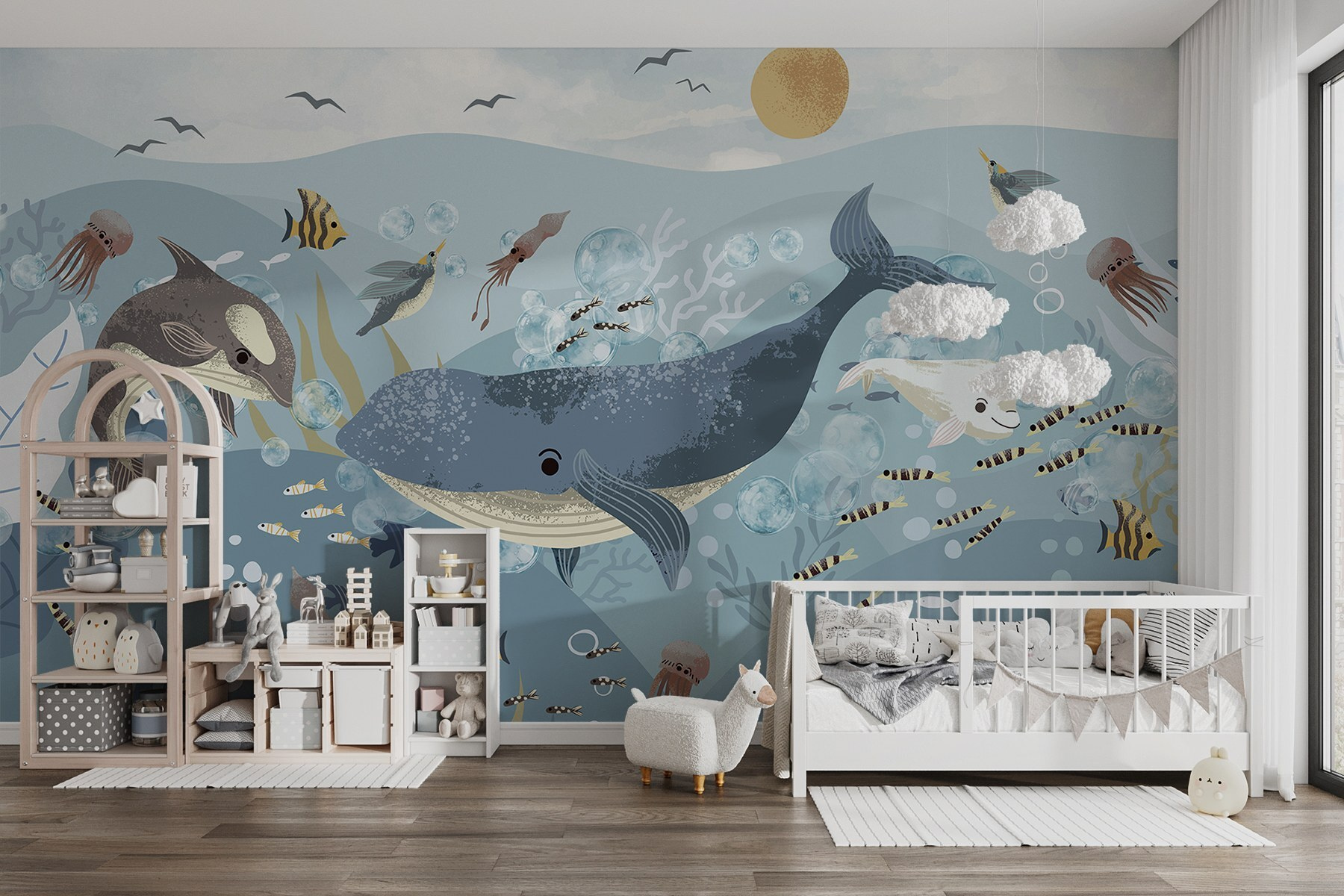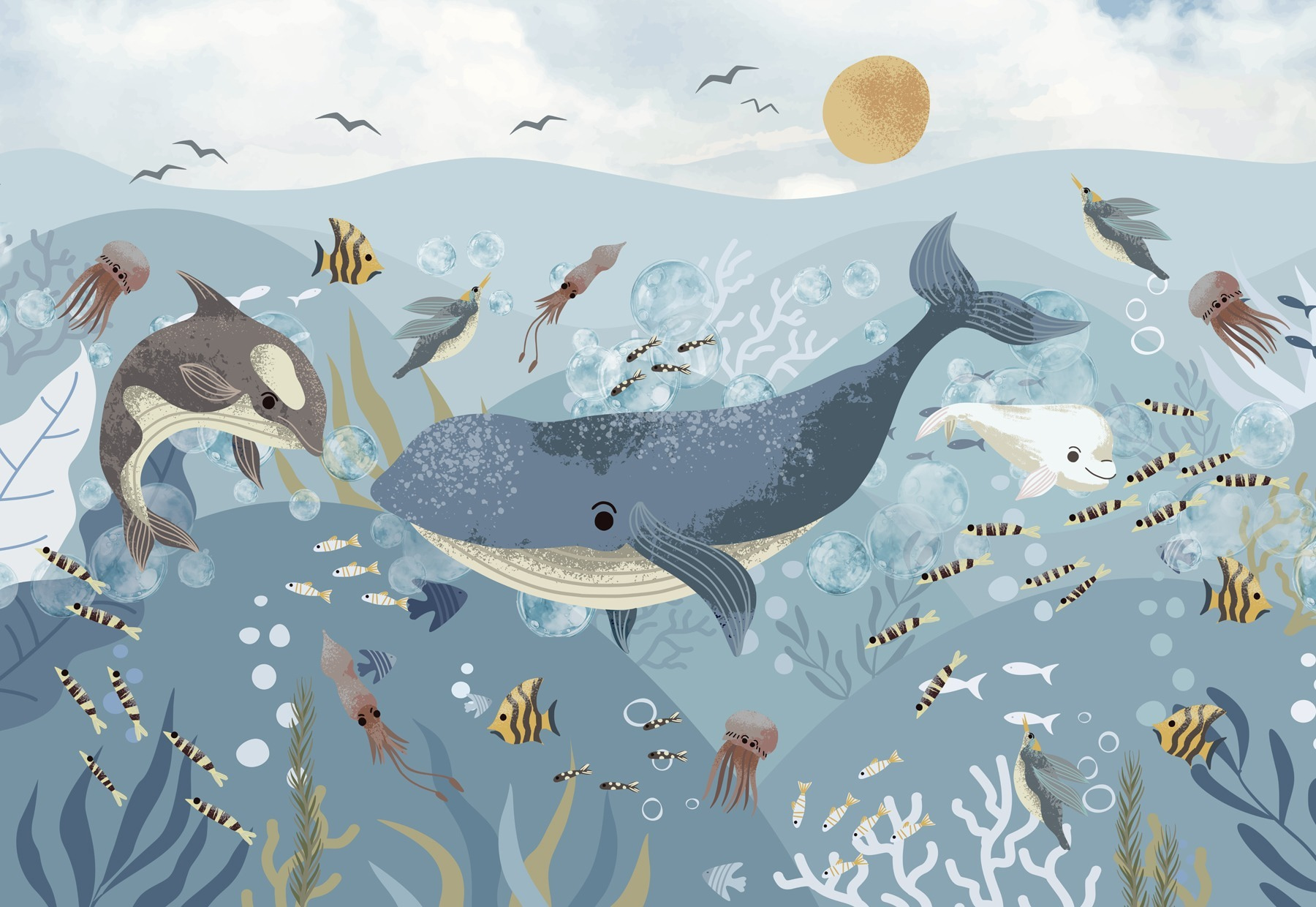 Ponořte se do světa rozmarů s touto nástěnnou malbou s živou směsicí ryb a velryb dovádějících pod jemnými vlnami oceánu. Představte si děti, jak se chichotají a pozorují barevné medúzy a roztomilé delfíny, kteří proplouvají kolem. Je to jako nakrmit svou představivost snídaní s přídavkem dobrodružství! Kamarádi se nechají unášet do pokoje a okamžitě pocítí chladivý oceánský vánek (nebo si ho alespoň představí). Tato nástěnná malba, která se skvěle hodí do dětského pokoje nebo do útulného čtecího koutku, promění každou stěnu ve spršku štěstí. Tak směle do toho, ať tato podmořská párty rozzáří nudné prostory!