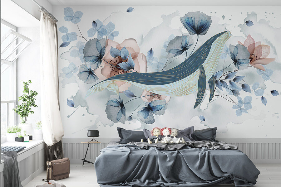Proměňte svůj prostor pomocí této okouzlující nástěnné malby velryby plující mezi jemnými květy a listy. Přinese jemný dotek oceánu přímo do vašeho domova. Představte si zasněné odpoledne strávené lenošením v útulném koutku, zatímco vás jemné pastelové barvy a plynulé linie unášejí do přímořského klidu. Jako by vám oceán šeptal tajemství dobrodružství, orámovaná krásou přírody. Ideální do dětského pokoje, uklidňujícího kancelářského prostoru nebo kamkoli, kde by se hodil nádech rozmarnosti. Navíc je to malá připomínka toho, že i ti největší tvorové si mohou užívat květinové snění. Ponořte se do světa, kde se umění setkává s klidem!