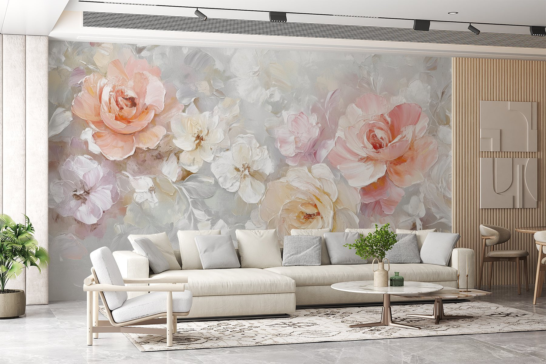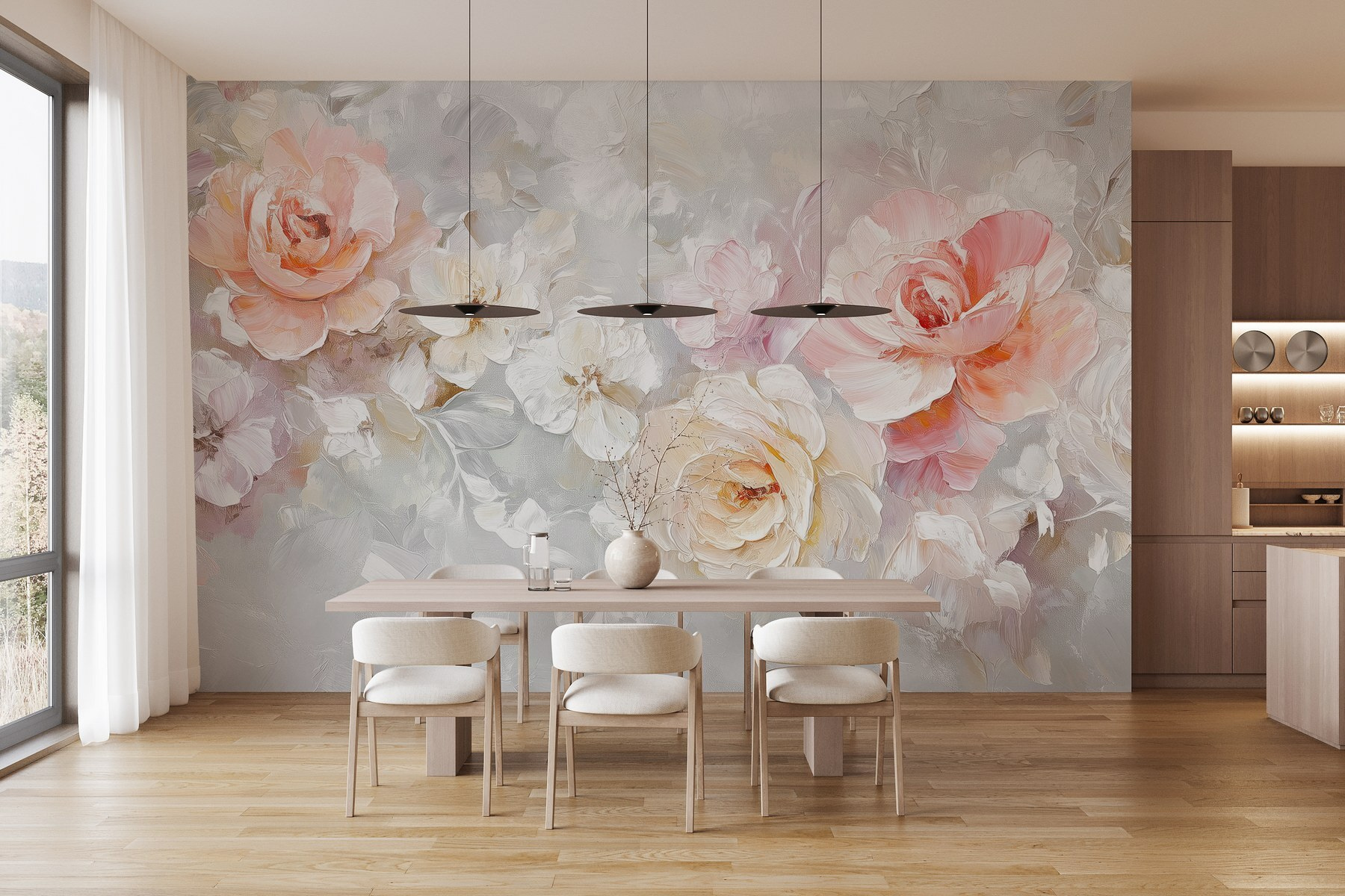 Proměňte svůj prostor pomocí této krásné nástěnné malby s květinami na jemném bílém pozadí. Představte si, že každý den vstupujete do zahrady, kde jen pro vás kvetou jemné okvětní lístky. Jemné barvy vytvářejí klidnou atmosféru, ideální pro útulný čtecí koutek nebo optimistickou kuchyni. Představte si, jak se u vás scházejí přátelé, a když obdivují umělecké dílo, nemohou si pomoci, ale cítí se o něco šťastnější. Je to jako přenést si kousek přírody do interiéru, aniž by bylo třeba zalévat nebo otravovat pylem. Prostě čistá vizuální radost – kdo by řekl, že nástěnná malba dokáže takhle zvednout náladu?