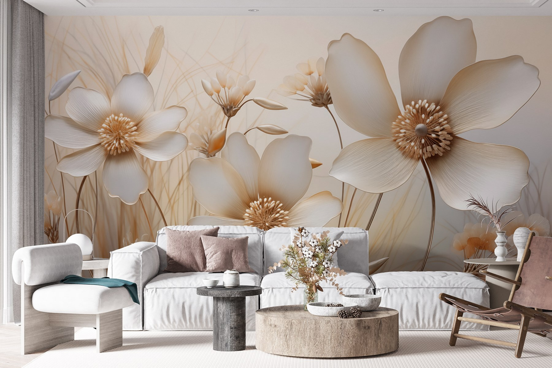 Proměňte každou místnost pomocí této úžasné nástěnné malby s jemnými květinami v jemných odstínech. Představte si, že se probouzíte do klidné krajiny, kde květy jako by šeptaly tajemství jara. Jemné barvy vytvářejí hřejivou, přívětivou atmosféru, která dokáže povznést i ty nejchmurnější dny. Ideální pro útulný čtecí koutek nebo jako výrazný prvek v obývacím pokoji, kterému dodá nádech klidu a šarmu. Je to jako přenést si malou zahrádku do interiéru, bez konve na zalévání! Jemná elegance, která působí osvěžujícím a nadčasovým dojmem, slibuje, že tato nástěnná malba krásně rozkvete v každém prostoru.
