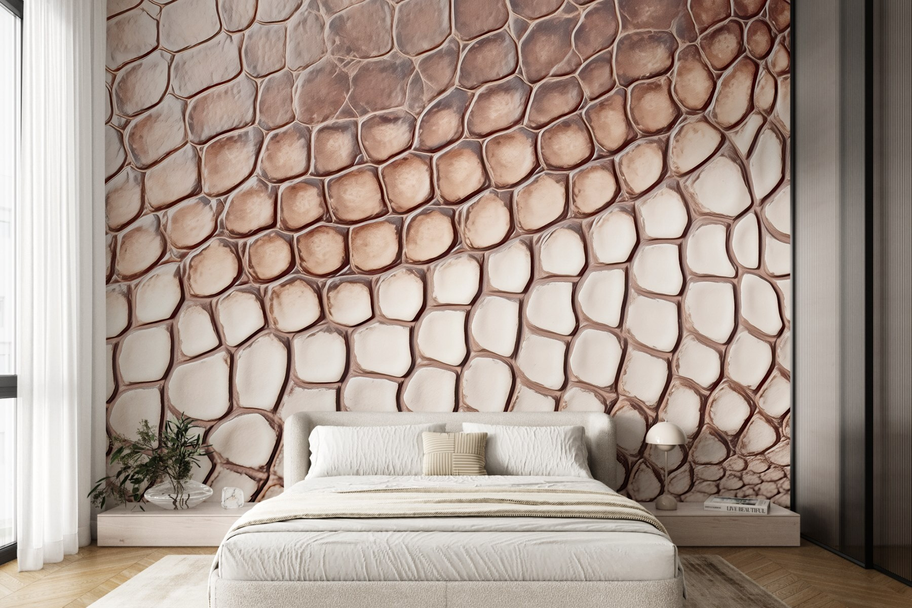 Proměňte svůj prostor pomocí odvážné a zajímavé nástěnné malby se vzorem plazí kůže. Představte si, že vstoupíte do místnosti, která působí trochu divoce, ale zároveň překvapivě útulně. Tento vzor dodává stěnám nečekaný šmrnc, díky němuž vynikne jejich osobitost. Perfektně se hodí na stěnu v obývacím pokoji nebo dokonce na kreativní pracovní místo a vybízí ke zvědavým pohledům a komplimentům.