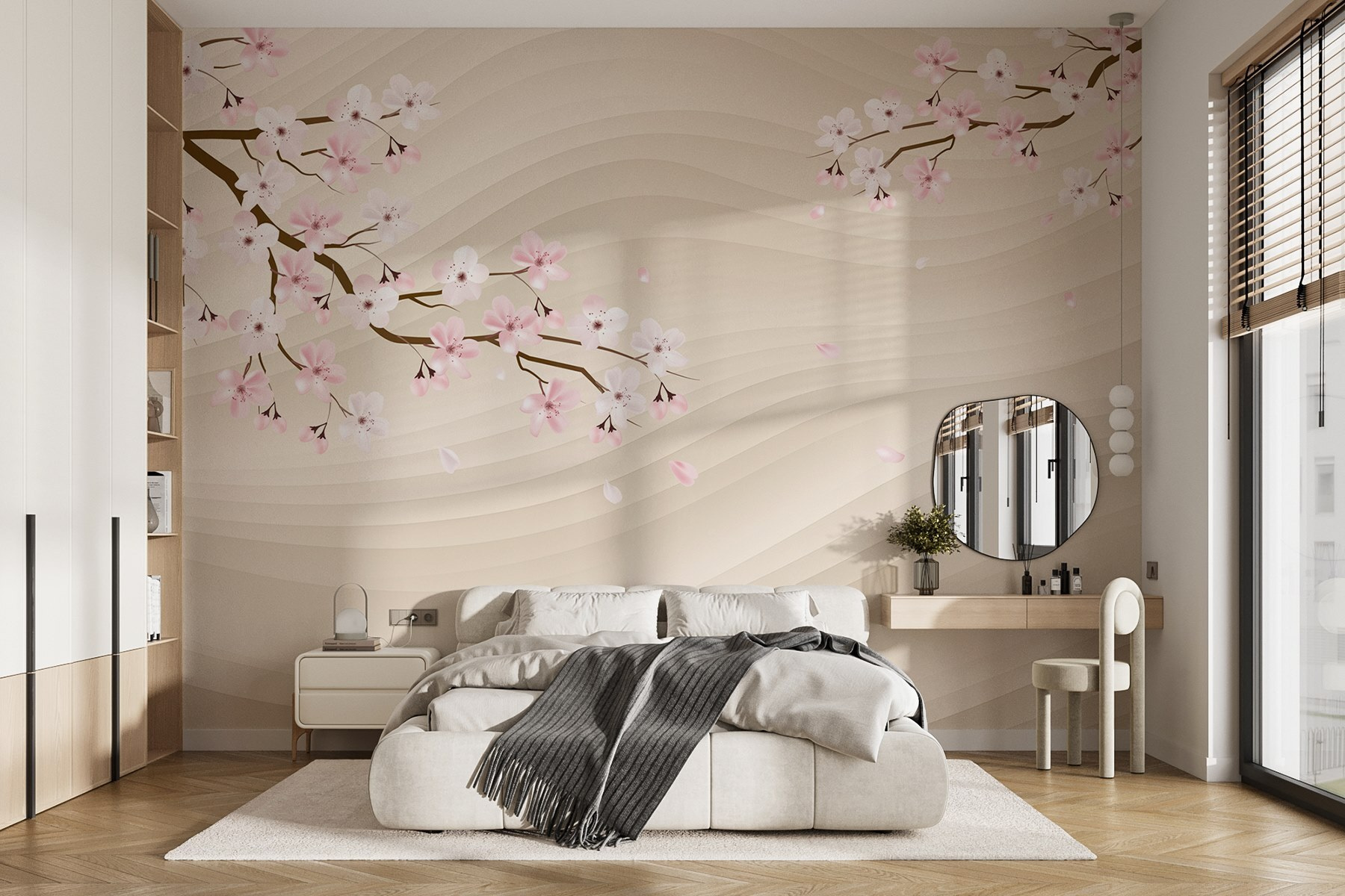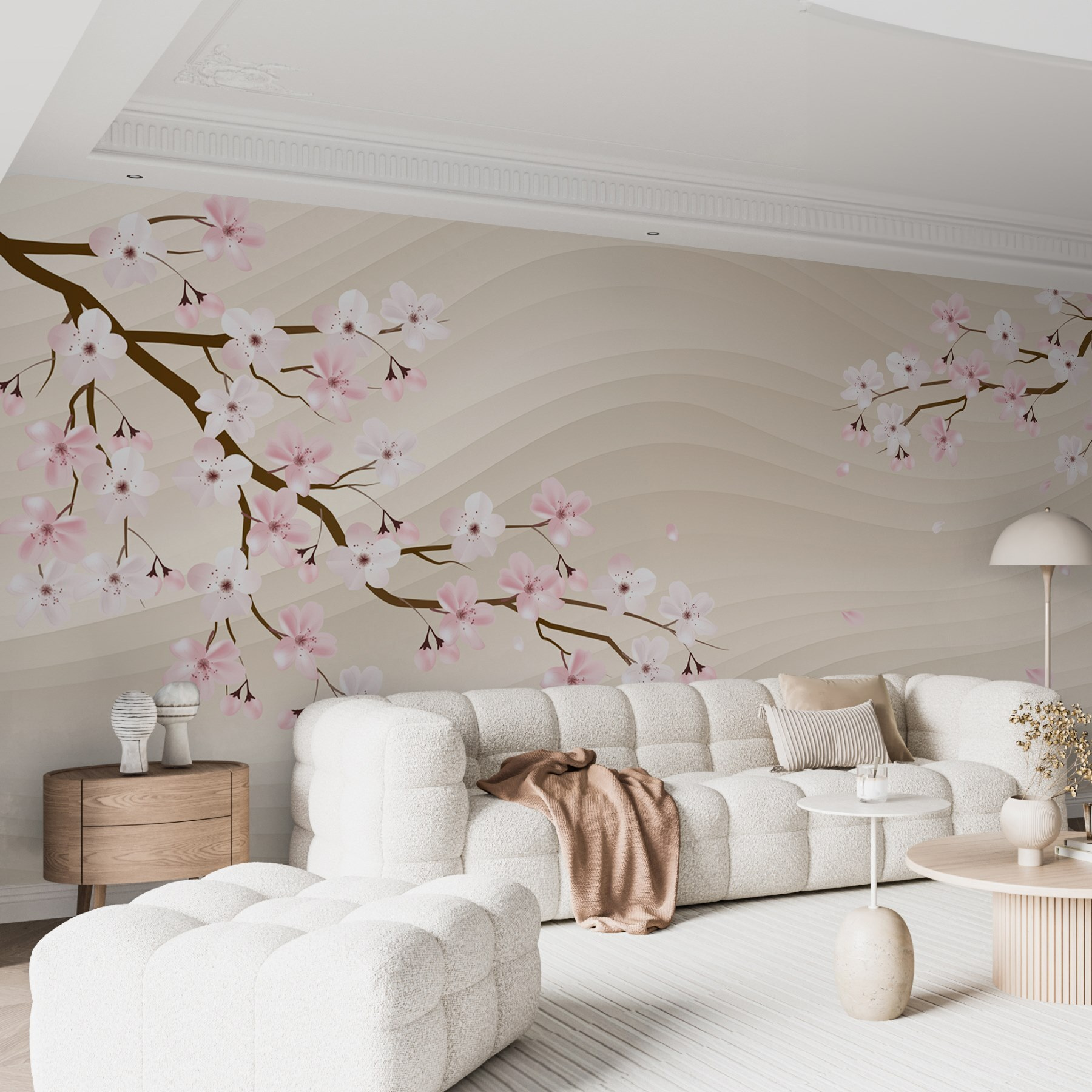 Proměňte jakýkoli prostor v klidné útočiště pomocí této okouzlující nástěnné malby větve stromu zdobené jemnými bílými a růžovými květy. Představte si, že vejdete do svého pokoje a okamžitě ucítíte jemný vánek a jemnou vůni jara – tato nástěnná malba přinese tuto uklidňující atmosféru přímo na vaše stěny. Splývavé pozadí dodává hloubku, takže máte pocit, že nahlížíte do klidné japonské zahrady, kde okvětní lístky tančí ve větru. Ideální do obývacích pokojů, ložnic nebo i do útulných čtecích koutků, kde vytvoří příjemnou atmosféru, která našeptává: “Zůstaňte chvíli.” Kdo by se nechtěl na takovém klidném místě zdržet o něco déle?