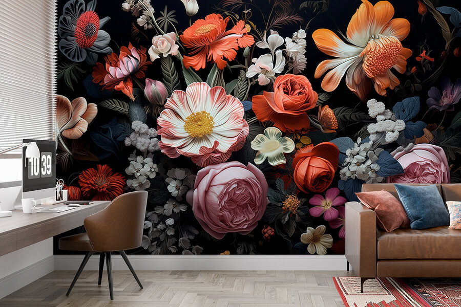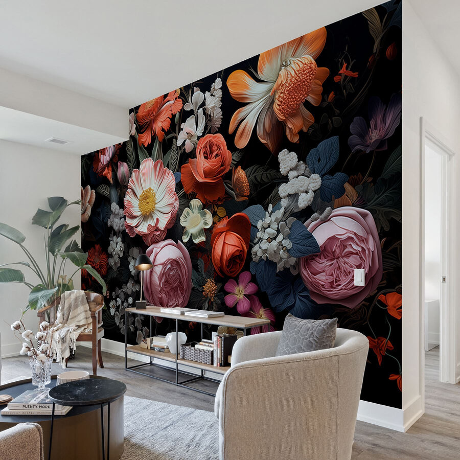 Proměňte svůj prostor pomocí této úžasné nástěnné malby s živou skupinou květin na výrazném černém pozadí. Představte si, že vstoupíte do místnosti, kde krása přírody zdánlivě vystupuje ze stěn. Každý květ má svůj vlastní příběh, živé okvětní lístky šeptají tajemství zahrady v plném květu. Tato nástěnná malba vnese teplo a život do jakéhokoli prostoru – je ideální pro útulný obývací pokoj nebo elegantní kancelář. Hosté se možná přistihnou, že na ni hledí a ptají se, kde je zahrada. Co je lepšího než trocha květinové inspirace, která vyvolá radost?