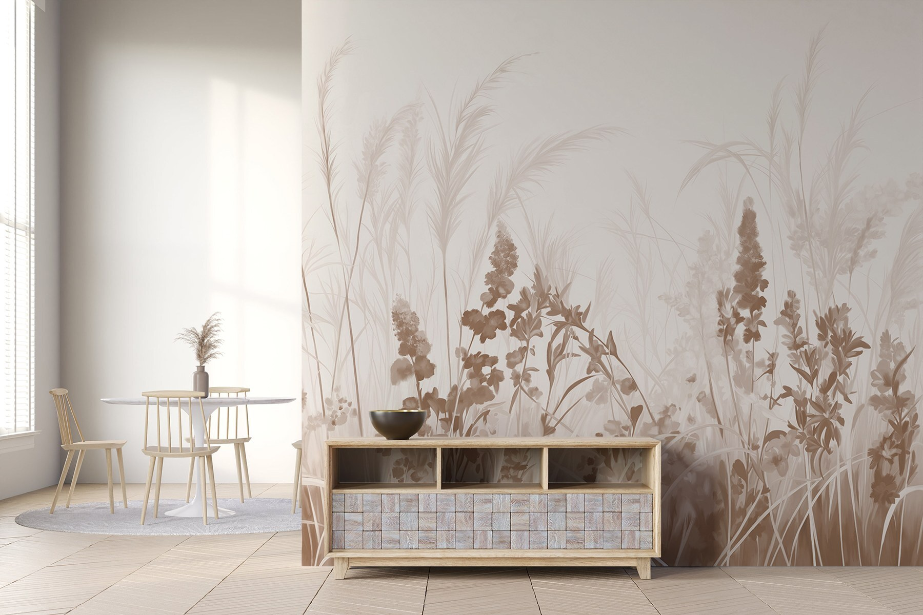 Proměňte každou místnost pomocí této klidné botanické nástěnné malby, která v jemných odstínech přináší krásu přírody do interiéru. Představte si, že vstoupíte do prostoru, který šeptá relaxaci jako jemný vánek v jarním dni. Květiny a trávy tančí po stěně a navozují pocit procházky klidnou zahradou. Ať už se nachází v obývacím pokoji nebo v útulném čtecím koutku, tento umělecký kousek dodá eleganci, aniž by toho řekl příliš mnoho. Popíjení kávy a klidné chvíle právě dostaly vylepšení. Je to dokonalý způsob, jak vytvořit uklidňující atmosféru, díky níž se každý den bude cítit jako mini útěk.