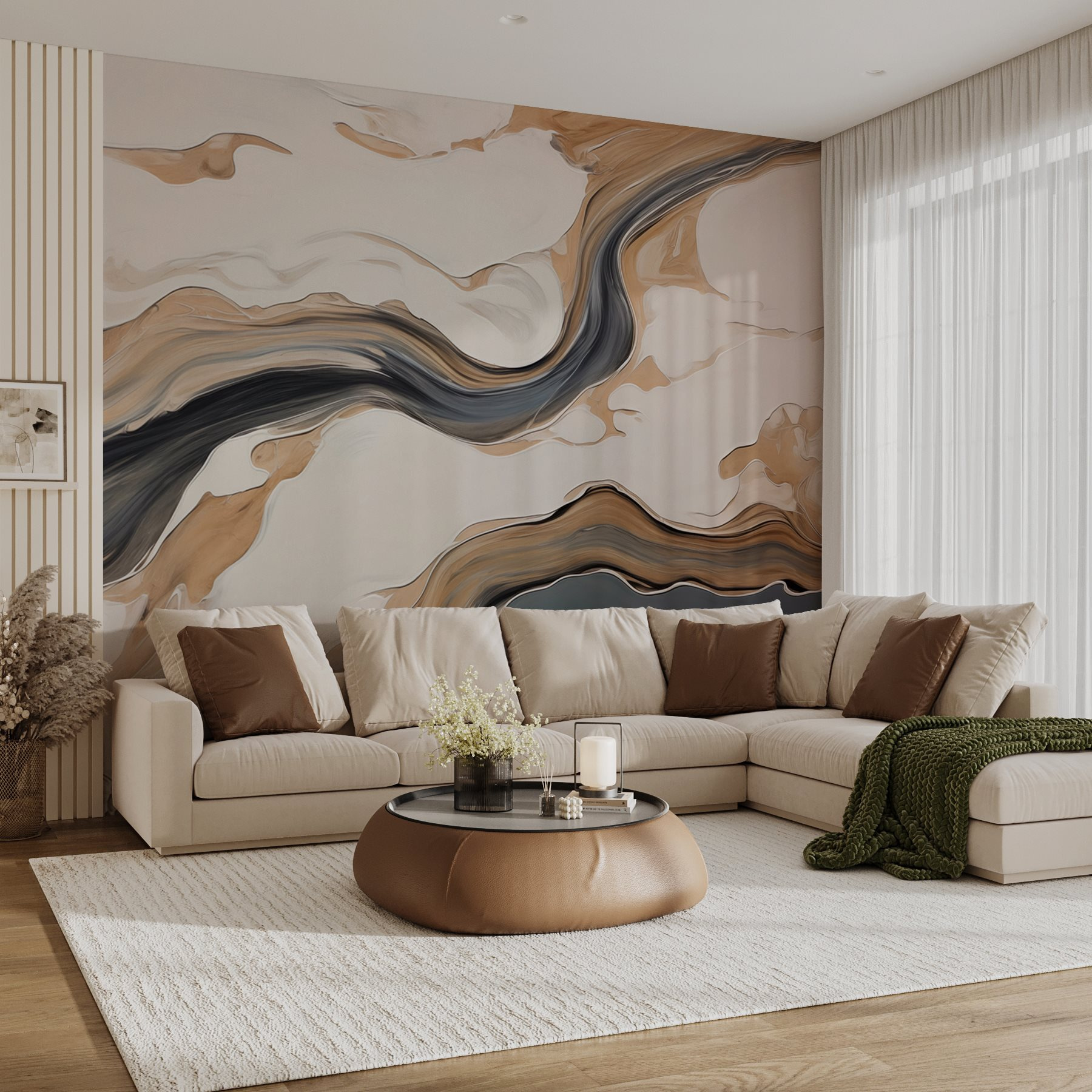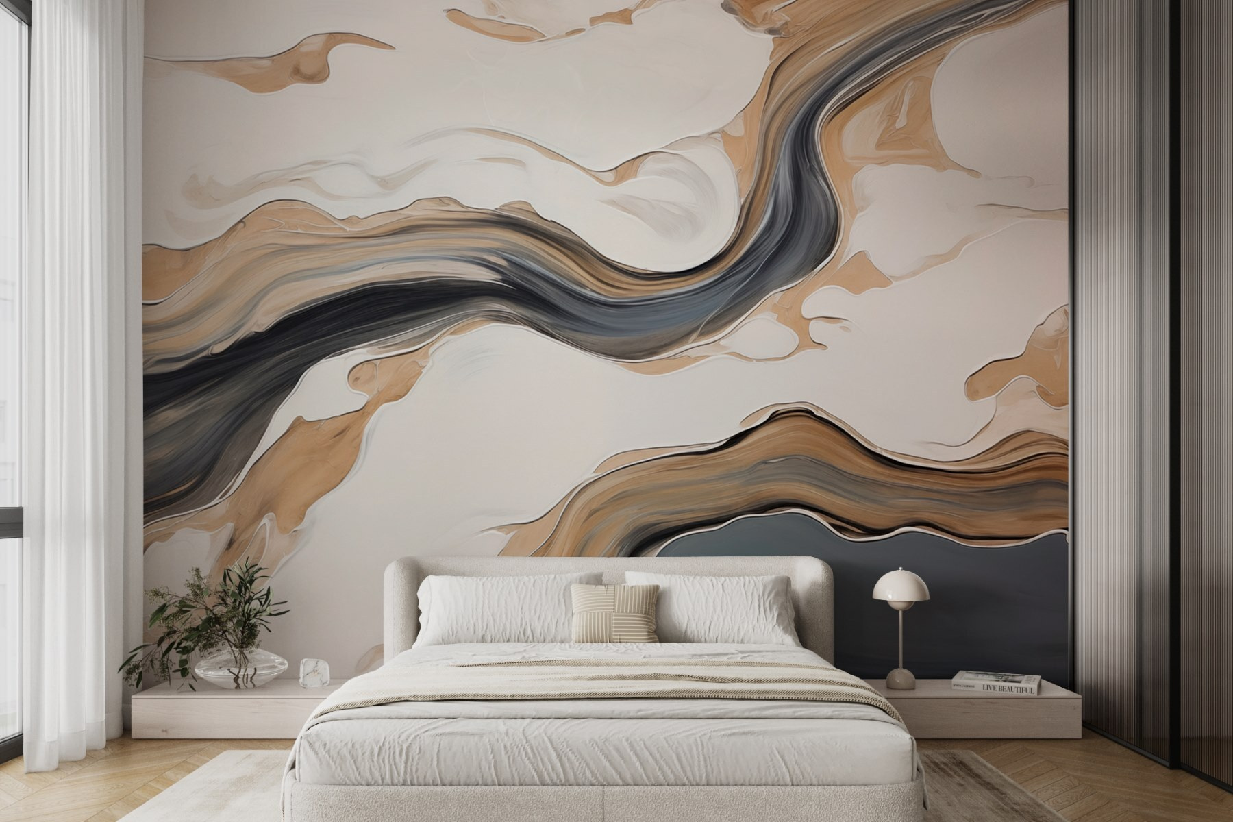 Proměňte jakoukoli místnost pomocí této podmanivé nástěnné malby s víry černé barvy a jemných odstínů na světlém pozadí. Jako byste vstoupili do snového abstraktního světa – v jednu chvíli dílo obdivujete a vzápětí podnítí vaši představivost. Představte si útulné večery schoulené s knihou, kdy vám stěny našeptávají kreativitu a klid. Je to jako mít umělecké dílo, které vybízí ke konverzaci a úžasu. Tato nástěnná malba, která je ideální pro ty, kdo touží po troše vkusu, aniž by zahltila smysly, bez námahy pozvedne jakýkoli prostor a dodá mu pocit sladkého domova.