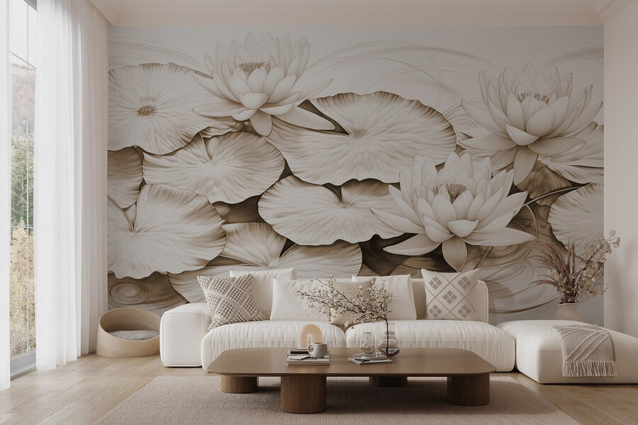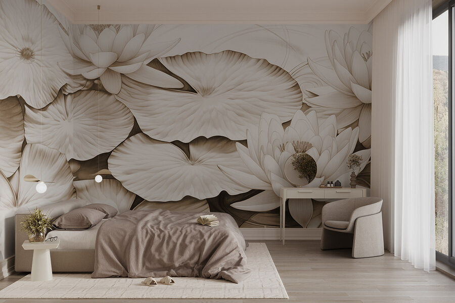 Proměňte každou místnost pomocí této okouzlující nástěnné malby s jemnými lekníny a nádhernými lekníny. Představte si, že vejdete do svého prostoru a budete mít pocit, že jste zabloudili do klidného rybníka s jemnými odlesky a něžnými vlnami. Jako by klid přírody byl jen kousek od stěny. Tato nástěnná malba je ideální pro ty, kteří touží po klidné atmosféře, a přináší kousek klidu – možná i inspiraci pro budoucí snění. Jemná, a přesto působivá, krásně tančí se světlem a vyvolává útulnou nostalgii. Dokonalý začátek konverzace nebo prostě jen klidné pozadí pro klidné chvíle.