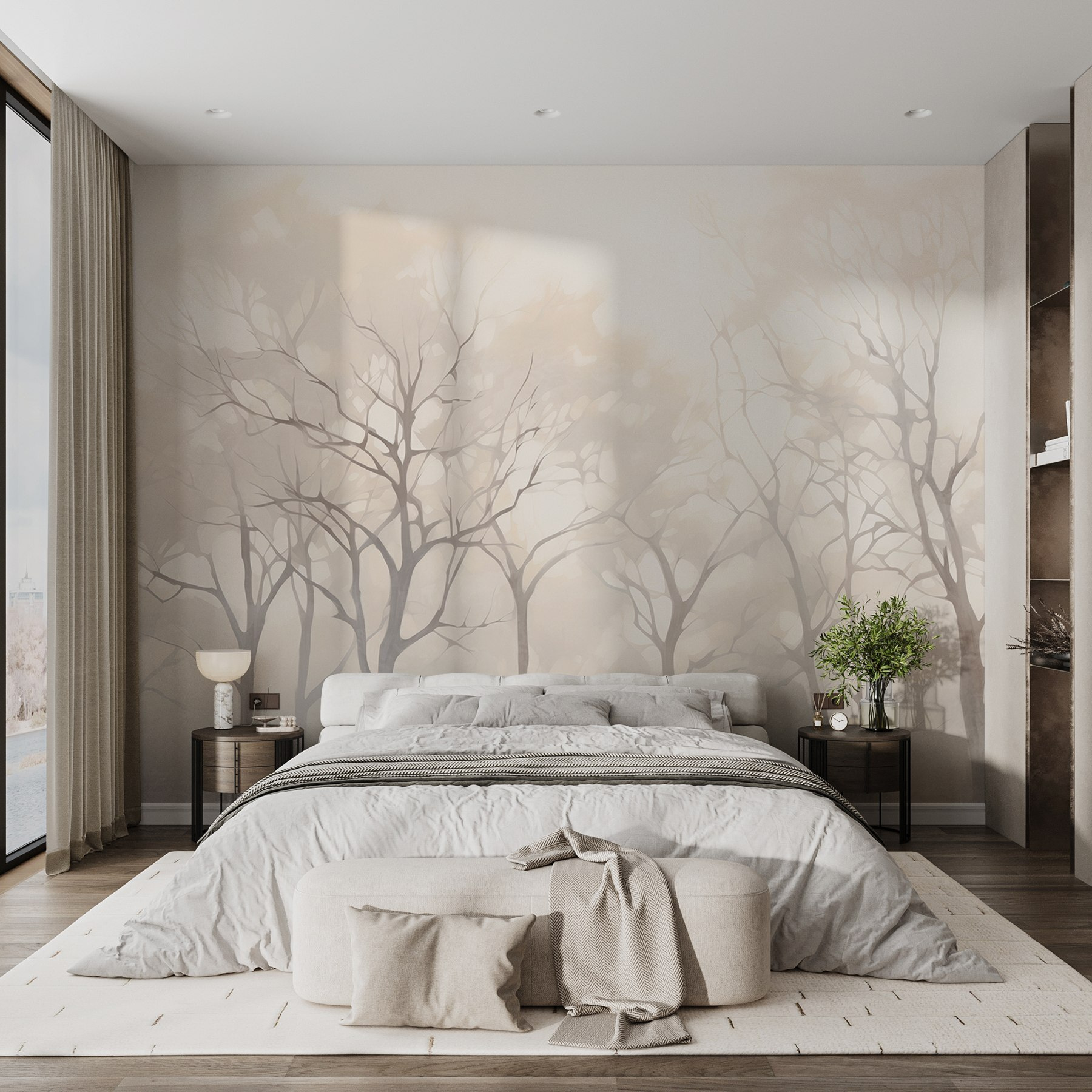 Proměňte svůj prostor pomocí zasněné nástěnné malby, která zachycuje klidnou lesní scénu, kde se stromy tyčí uprostřed jemné mlhy. Představte si, že vstoupíte do klidného okamžiku a cítíte, jak vás omývá jemný šepot přírody. Tlumené barvy přinášejí pocit klidu – ideální pro útulný čtecí koutek nebo klidné útočiště v ložnici. Je to jako přenést kousek venkovní přírody dovnitř bez špíny a hmyzu! Představte si, jak se ztrácíte v myšlenkách, popíjíte kávu a tato nástěnná malba vás zahaluje do svého hřejivého objetí. Není to jen dekorace, je to výzva k hlubšímu nadechnutí a odpočinku.